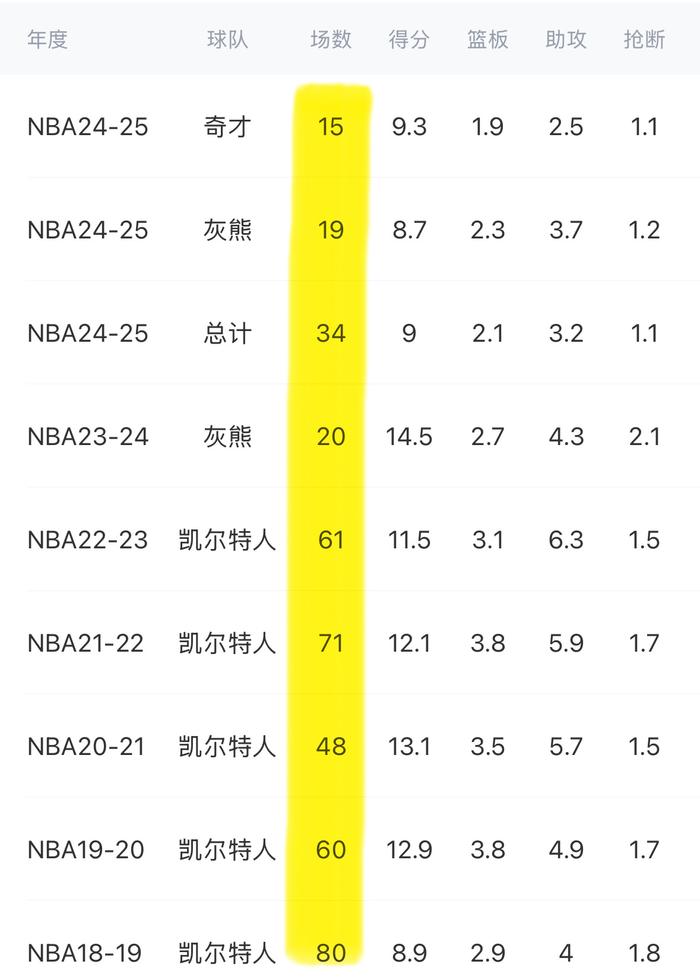 01 过去3个赛季,因为伤病,他分别只出战了19,34和20场比赛,出勤率着实让人担忧。新赛季他的首要任务是保持健康,保证出勤率,不然都是白搭。